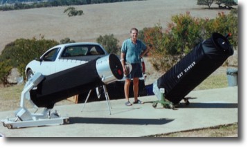 Greg Walton proudly stands by the two deep sky viewing telescopes he built of a truss-tube construction, these are pictured on the lower, smaller viewing platform. Sky Dancer on the right is Greg's own personal scope, while Sky Venturer is mechanically driven scope, it is for use by the MPAS.
