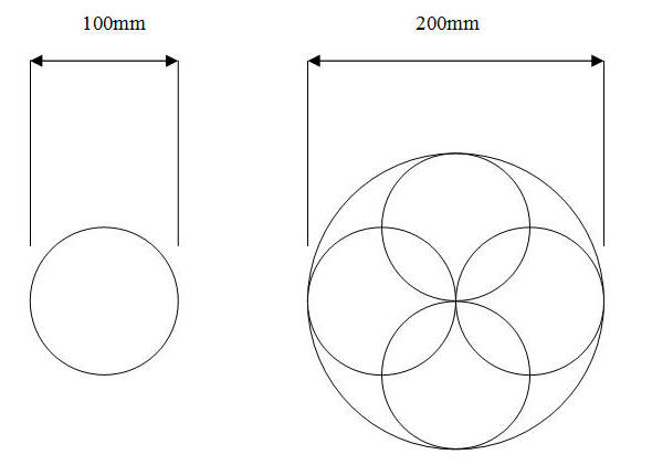 The larger the telescope the brighter the image you see at the eyepiece and the faster we can take a photo. A telescope 200mm in diameter collects 4 times the light of a 100mm telescope. As you can see four 100mmm circles can fit in to a 200mm circle. See diagram below.