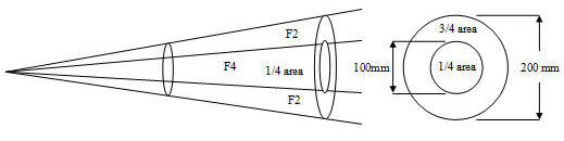The inverse square law says when you double the diameter; the area will increase by 4 times. This work for us and we can take a shot in ¼ of the time. But if we double the magnification, we will double the F ratio and we will be back were we started, because we will be looking at an area of sky that is only ¼ of the size, which would contain ¼ of the light. See diagram below.